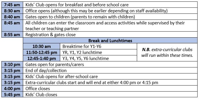 School is open to all children from 8:45am-3:15pm, with compulsory attendance time starting at 8:55am each morning. All children should be in school Monday-Friday from 8:55am-3:15pm with the exception of Reception children during their induction.
