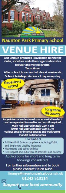 If you are interested in hiring our venue, please get in touch with Helen Nash, Business Manager, by email finance@nauntonpark.gloucs.sch.uk or call 01242 513114 to discuss further.