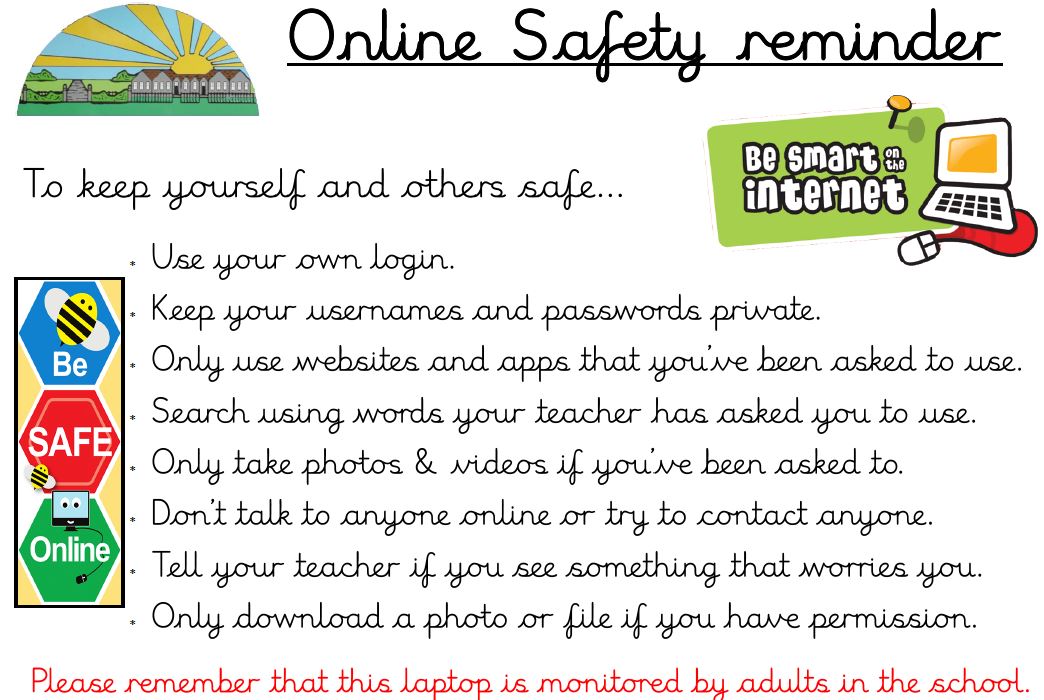 All lessons in which devices are being used start with an online safety reminder or discussion with the children. All of the laptops that pupils use in school also feature our online safety reminders: